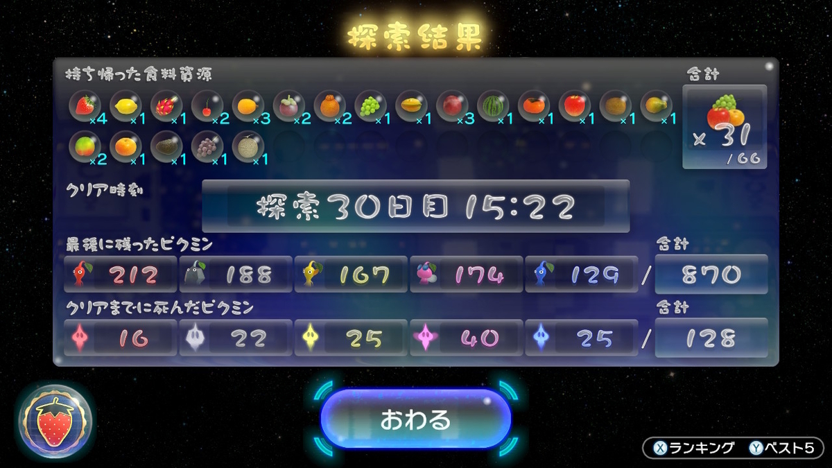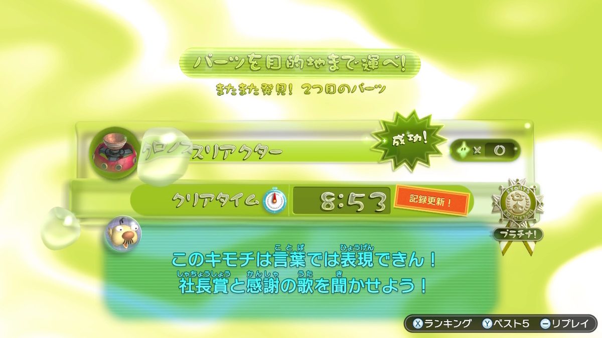 経過時間で称号が変わるので、全ての敵を倒さず、全てのピクミンを引っこ抜かずに、必要最低限のピクミンで頑張りました。